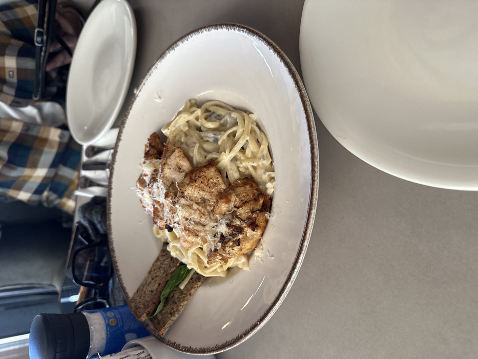 This image depicts an indoor dining scene at a cafe or restaurant in Antalya, Turkey. The central focus is a white ceramic plate with a textured brown rim, positioned on a light grey table. The plate holds a serving of fettuccine pasta coated in a creamy white sauce containing visible dark fragments, likely mushrooms. Several pieces of grilled chicken breast, exhibiting char marks and a golden-brown exterior, are arranged atop the pasta. The entire dish is lightly dusted with grated white cheese. To the left of the pasta, a slice of dark, likely whole-grain bread, with a single green leaf (possibly spinach or basil) nestled beneath it, rests against the food. In the background on the left, a dark blue/black salt shaker, a small white ceramic holder containing a white paper sachet, and dark aviator-style sunglasses are visible on the table. To the right, an empty white oval plate is partially visible, along with the mid-torso of an individual wearing a plaid shirt (blue, brown, and white pattern), whose hands are partially obscured by a dark rectangular object, possibly a mobile device. Silverware is faintly discernible on the table. The lighting is bright and even, indicating an indoor setting.