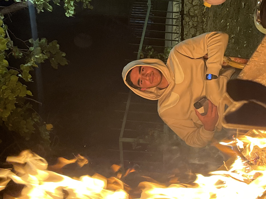 A person wearing a beige hoodie stands near a fire. The individual is holding a phone. The flames are prominent in the foreground, with smoke rising. Trees and a fence are visible in the background. The picture appears to be taken outdoors at night.