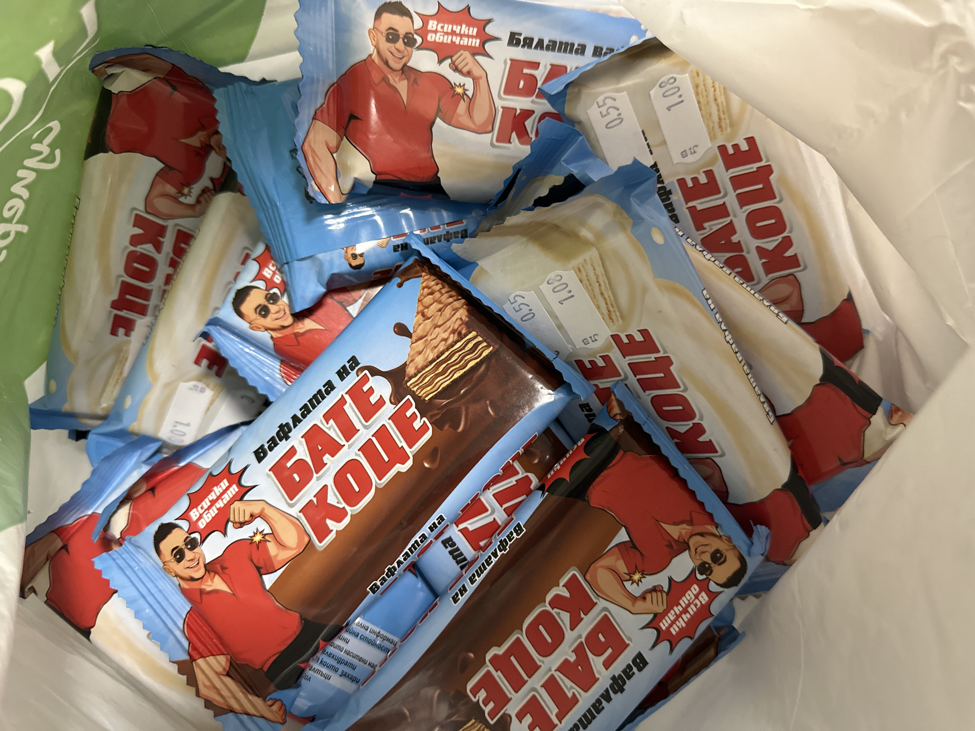 A close-up, top-down view depicts a collection of approximately ten to fifteen individually wrapped wafer bars contained within a light green shopping bag. The interior of the bag is white. The wafer bars are of the "БАТЕ КОЦЕ" (BATE KOTSE) brand, as indicated by large red Cyrillic text on the packaging. Two distinct variations are visible: one with a dark brown, presumably chocolate, coating, and another with a white or cream-colored coating. Each wrapper features a cartoon illustration of a man with short dark hair, sunglasses, and a red collared shirt, flexing his left bicep. A red, star-shaped graphic labeled "Всички обичат" (Everyone loves) is positioned near his bicep. Additional Cyrillic text, "Вафлата на" (The wafer of), is also present. Several white rectangular price tags are affixed to the wrappers, displaying numerical values such as "0.55" and "1.08". Crucially, one tag next to the "1.08" value clearly shows "лв," indicating Bulgarian Leva as the currency. The scene depicts recently acquired food products. Based on the Bulgarian language text and the currency (BGN) on the price tags, these items originate from Bulgaria and were likely purchased at a specialty ethnic grocery store. Such stores cater to specific communities and can be found in diverse urban environments. While no specific visual markers for Hamburg, Germany, are present within the image, the scenario is consistent with a purchase made at a Bulgarian or international food market within a multicultural city like Hamburg.