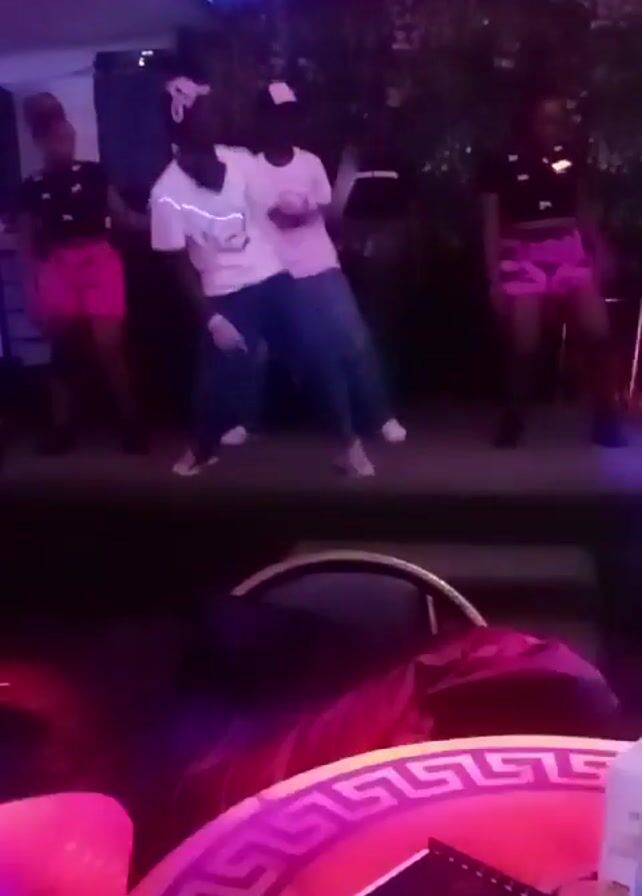 Here is a detailed description of the video: The video shows four individuals dancing on a small stage, likely at a nightclub or bar