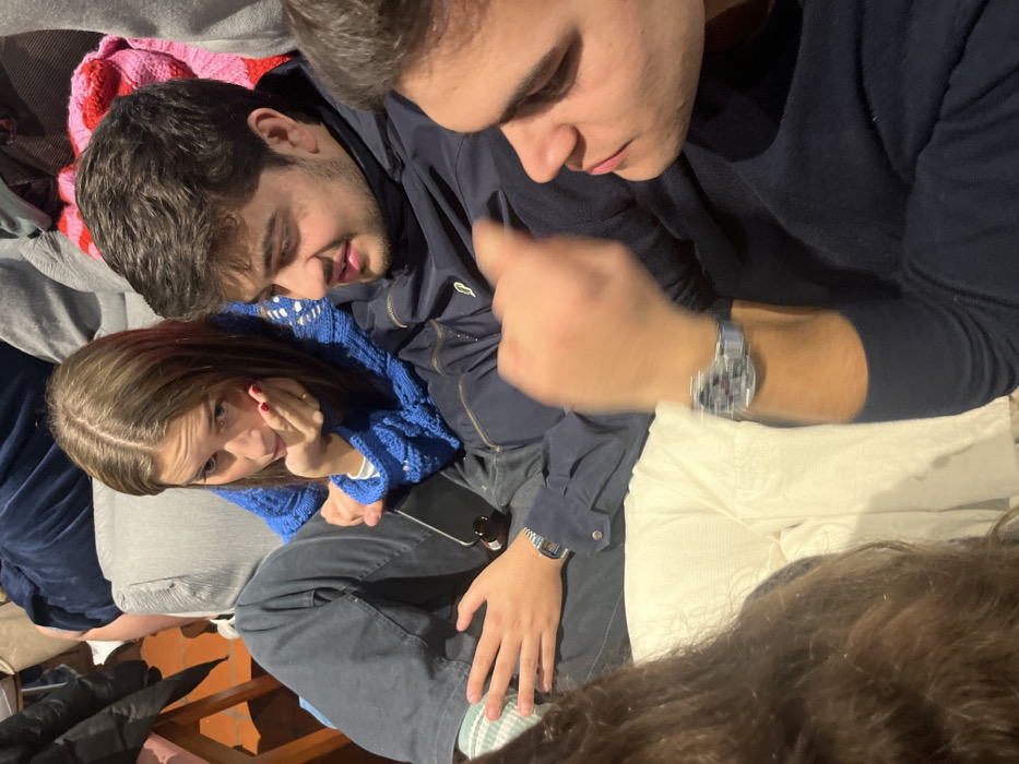 Three people are sprawled on a couch covered with blankets. A woman in a blue sweater looks up with a hand near her face. Beside her, a man with dark hair rests his head. Another man, wearing a navy sweater, is to the right. He wears a watch, and his arm is extended towards the camera, slightly out of focus. A cell phone and small bottle sit on the couch near the center. Part of a wooden chair and brown hair are visible in the lower part of the frame.