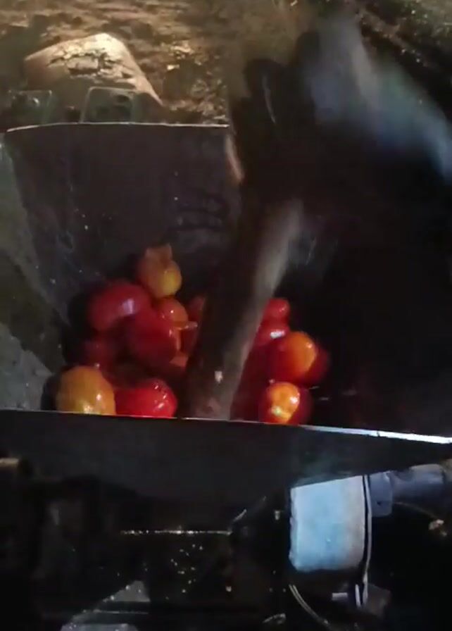 In a close-up, outdoor shot, someone loads tomatoes into a gray, metal, mechanical tomato press