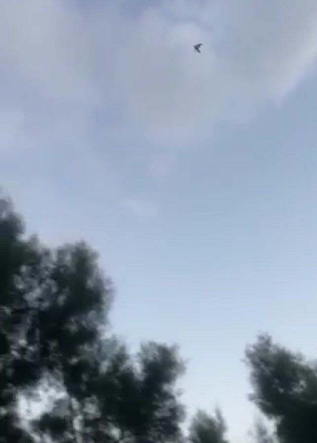 sky with light clouds, and a silhouette of a bird flying across the upper center of the frame. Below, in the foreground, are treetops with green foliage.