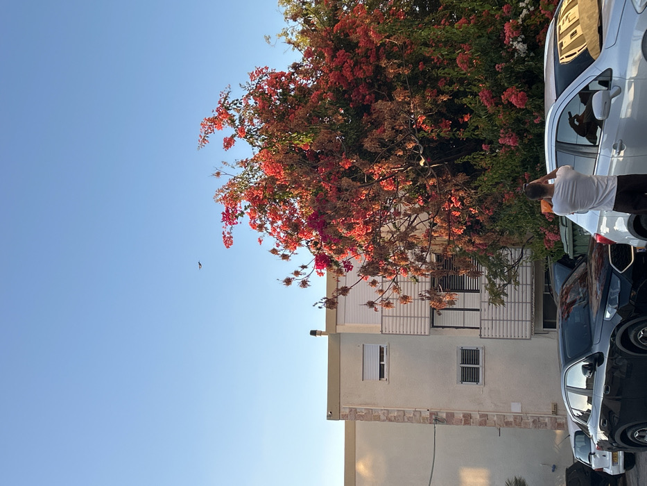 This image captures a residential street scene in Haifa, Israel, under a clear blue sky with a single bird in flight in the upper left. On the left, a light-colored multi-story residential building features a facade with a vertical section of stone cladding, multiple windows fitted with white roller shutters, and a balcony with horizontal railings. A security camera is mounted on the building's roofline. Dominating the right and central midground is a large, vibrant bougainvillea plant with an abundance of red and pink blossoms, interspersed with some drier, browner foliage. In the foreground, a male individual, seen from behind, wears a white t-shirt and dark shorts. He is standing beside a silver SUV, holding a black smartphone horizontally with both hands, as if actively photographing or recording the scene towards the bougainvillea. To his left, a black SUV is parked, and further left, a white hatchback is partially visible. A green dumpster is located behind the black SUV. The lighting suggests late afternoon or early evening.