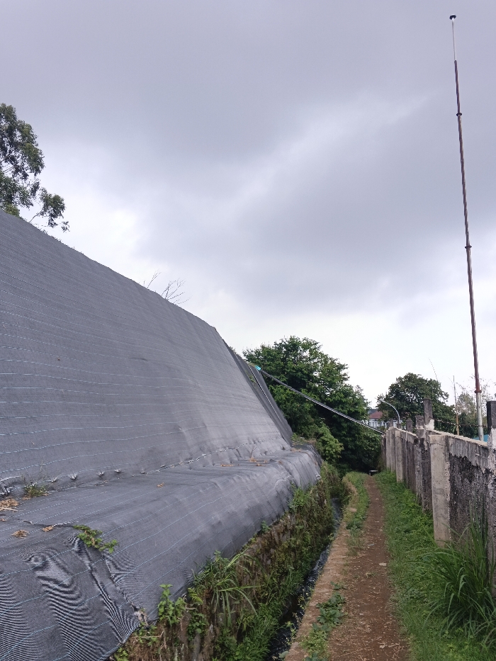 The scene depicts an outdoor, unpopulated pathway in Koipa, Papua New Guinea, under an overcast sky. On the left, a steep earthen embankment is covered by black woven mesh, consistent with geofabric or shade cloth, secured horizontally with lines and extending upwards and into the background. Sparse green vegetation grows at the base of this slope, adjacent to a narrow, dark drainage channel. A dirt path, approximately 1.5 meters wide, occupies the middle ground and recedes into the distance. To the path's right, a weathered concrete block retaining wall runs parallel, displaying exposed aggregate and dark staining. Beyond this wall, dense green foliage and trees are visible. A tall, slender, segmented pole, consistent with a utility or antenna mast, stands vertically on the far right, extending towards the sky. Multiple tensioned cables traverse the upper mid-ground, extending from the vicinity of the covered slope towards the right side of the frame.