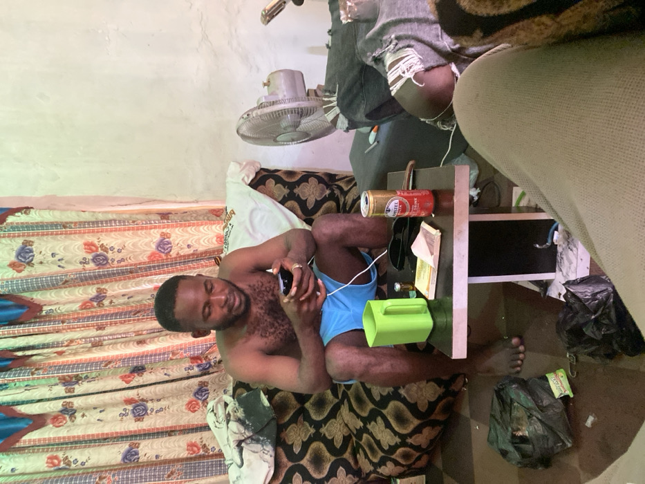 The scene depicts an interior room in Zaki Biam, Nigeria. A dark-skinned male, shirtless with chest hair and wearing light blue athletic shorts, sits on a patterned brown and gold sofa. He is barefoot and actively engaging with a dark-colored smartphone held in his right hand, a ring visible on his right ring finger. A white charging cable extends from the phone towards the floor. In front of him, a small rectangular coffee table holds a lime-green plastic mug, a red and gold Amstel Malta beer can, black sunglasses, a small clear glass vial, and a folded paper document. To the right, an off-white electric standing fan is visible. Further right, partially visible, are the legs and lower torso of another individual wearing ripped grey jeans, seated on a separate piece of furniture. In the foreground, the lower body of a third individual, clad in light-colored trousers, is partially visible, indicating the perspective of the camera operator. The background features a wall with faded, light-colored paint and floor-length floral curtains displaying red, blue, and purple flower patterns. The floor is cluttered with dark plastic bags, one appearing to contain items, and a green snack wrapper.