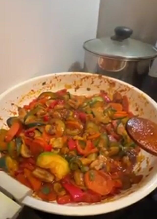 A close-up video shows a large white pan filled with mixed vegetables in a thick sauce