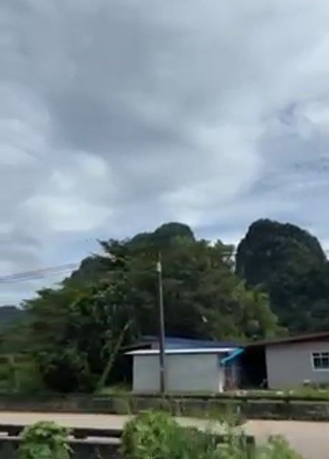 The camera is moving, likely from a vehicle, showing a landscape. In the foreground is a concrete barrier with greenery growing below. Beyond this, there's a road and a building with a light grey exterior and a light blue awning. Further back, there are trees and lush vegetation. The background is dominated by large, green, hilly formations under a sky filled with cloudy overcast conditions. There are utility poles and power lines visible throughout the scene.