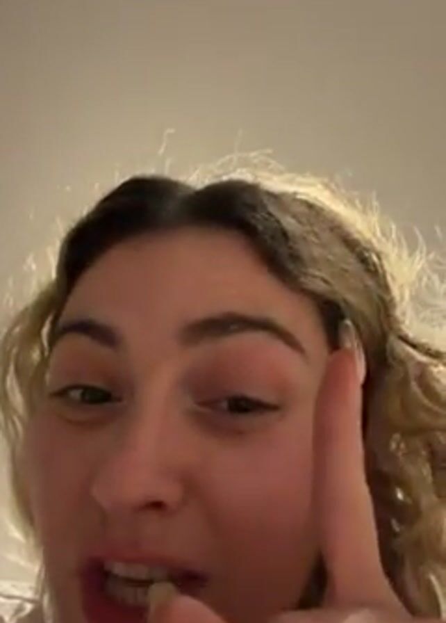 A woman with shoulder-length curly hair with dark roots and blonde highlights is centered in the frame, looking directly at the camera. She has fair skin and is wearing a light-colored top. She is indoors with a plain, light-colored wall visible behind her. She raises her index finger as if making a point and brings it to her mouth in a silencing gesture. She moves her hands as she speaks.