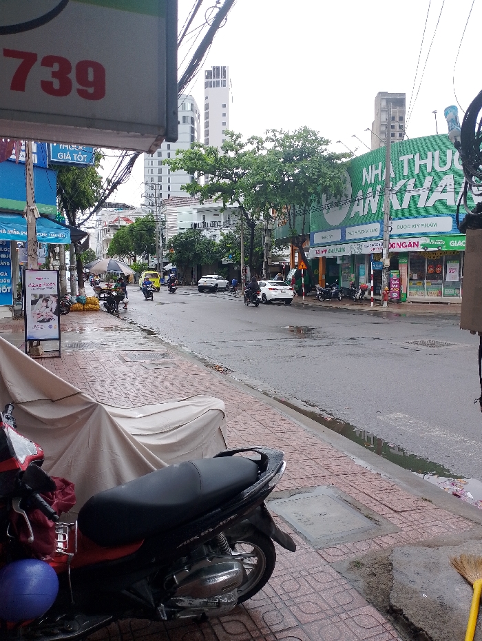This image depicts an urban street scene in Nha Trang, Vietnam, characterized by a wet asphalt road under an overcast sky, suggesting recent rain. In the immediate foreground, a red and black scooter (Honda Air Blade) is parked on a reddish-brown tiled sidewalk, facing right. A blue helmet rests on its front. Behind the scooter, a light-colored tarp covers an unidentified object. A yellow broom is visible on the far right edge of the sidewalk. Overhead, a white sign with the red numbers "739" is partially visible. The midground features a multi-lane street with visible tire tracks on the wet surface. Several motorbikes are in motion or parked along the street. A white car and a yellow van are also present on the road. On the left side of the street, a person under a large, dark umbrella is visible, possibly a street vendor, with merchandise displayed on the sidewalk. On the opposite side of the street, a large green building with prominent white Vietnamese text "NHÀ THUỐC AN KHANG" (An Khang Pharmacy) dominates, along with smaller storefronts displaying various advertisements and signs, including "DƯỢC MỸ PHẨM" (Pharmaceuticals & Cosmetics). Utility poles are heavily laden with a dense network of overhead wires, and green-leafed trees line sections of the street. In the background, multiple tall, modern white buildings rise against the light, overcast sky, indicative of a city skyline. One slender building features distinctive recessed sections near its top. The scene is active with vehicular traffic and reflects typical urban infrastructure in Nha Trang.