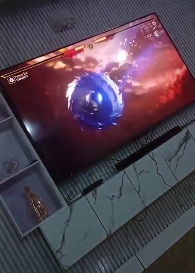 television screen displaying a video game, likely Mortal Kombat, with two armored characters engaged in a fight. The background is a fiery red and orange scene. The television is mounted on a white marble-patterned cabinet. The wall behind the television has a light-colored striped pattern. There is a small decorative shelf to the left of the television with a gold-colored ornament. The camera is angled upwards towards the screen. A soundbar is positioned below the television screen. A person’s voice can be heard in the background.