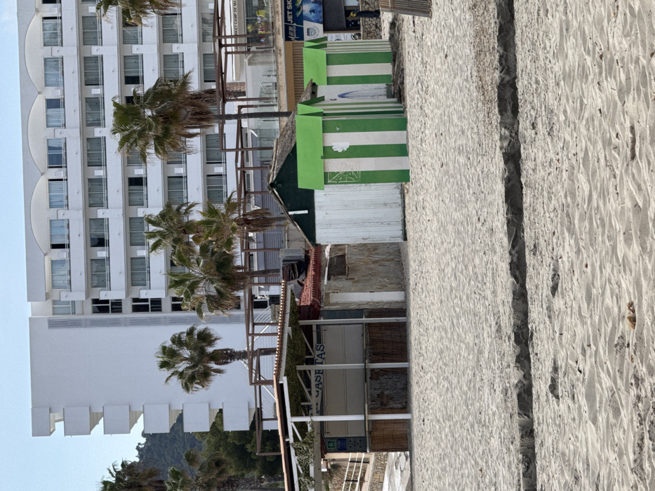 The image presents a static, unoccupied beach scene in Es Camp De Mar, Spain. The foreground consists of light-colored sand, marked by a prominent horizontal ridge. In the midground, a closed beach kiosk or bar structure, featuring "CASETAS" partially visible on a sign and a slatted roof with artificial foliage, stands to the left. Adjacent to it are five beach huts; one larger hut is white with a dark green roof, and four smaller ones are painted with vertical green and white stripes and green roofs. Several palm trees are interspersed behind these structures. In the background, a large, multi-story white hotel building dominates the upper frame, characterized by numerous balconies and windows. Signs for "MARKET CAMP DE MAR" and "JET SKI" are discernible on an elevated platform structure situated in front of the hotel. The sky above is clear and light blue. No individuals, actions, or interactions are observable within the frame.