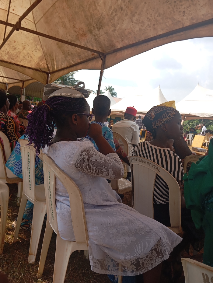 Under a makeshift tent, a group gathers, seated on white plastic chairs with "ROSEWARD RENTAL" printed on the backs. A girl in a white dress and matching headwear sits in the foreground. To her right, another woman with a patterned headscarf wears a striped top. Men and women are scattered throughout the background, with additional white tents visible in the distance, suggesting an outdoor event or gathering.