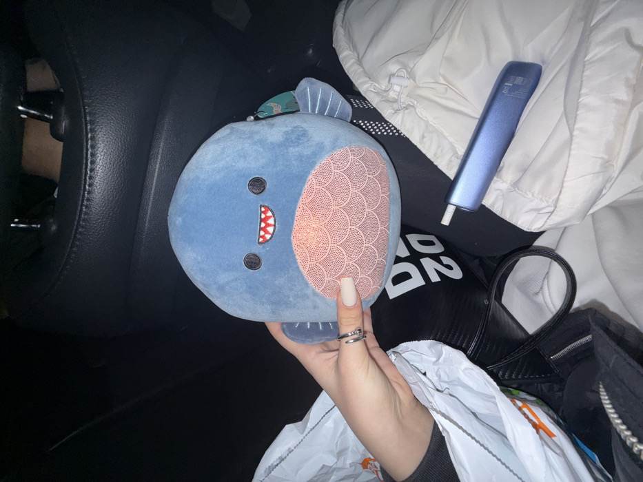 The scene is set within the dark interior of a vehicle in the city of Zlatitrap, Bulgaria, under low light conditions. A human hand, displaying light-colored manicured fingernails and a silver-colored ring on the ring finger, holds a blue plush toy. The toy is spherical, features black embroidered eyes, a red smiling mouth with white teeth, and a textured pink, scaled abdomen. A product tag is visible on the toy's right side. To the immediate left of the hand, a portion of a white plastic shopping bag is visible, containing various items. Beneath the hand, a black bag strap is present. On the right side of the frame, a blue, elongated electronic device, consistent with a heated tobacco or vaping apparatus, rests on a white garment that covers a person's leg. The garment appears to be a jacket or blanket. In the upper background, the dark upholstered headrest of a car seat is visible.