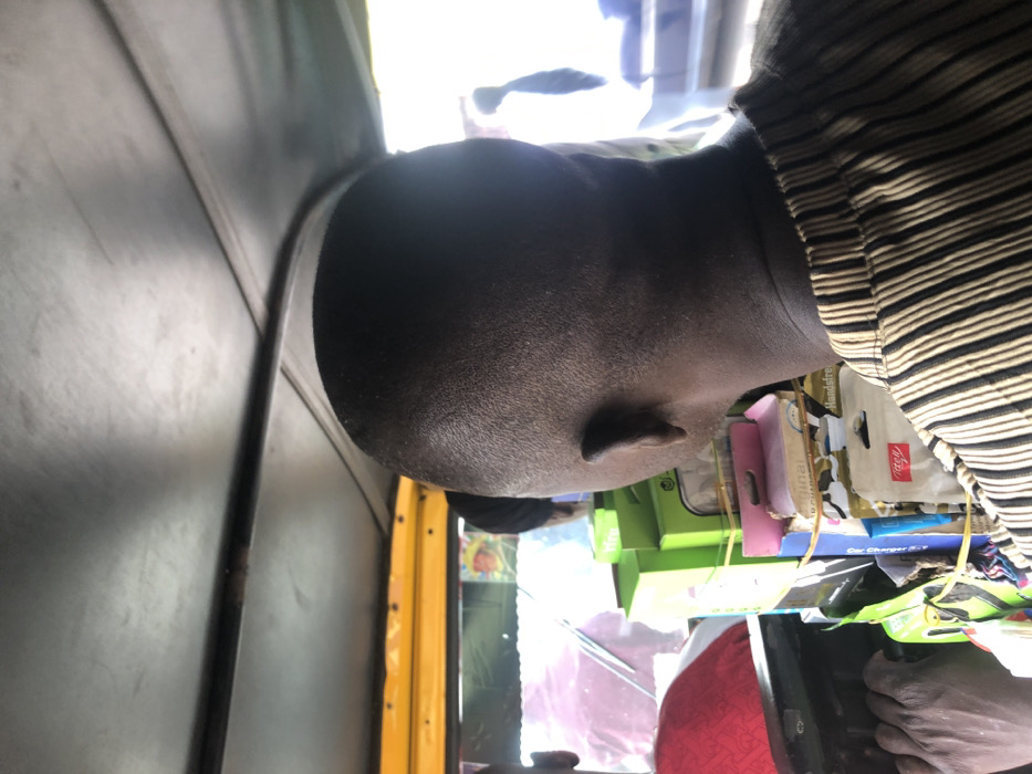 An interior view from a commercial tricycle taxi (Keke Napep) in Lokoja, Nigeria, focuses on the back of the driver's head and right shoulder. The driver, an individual with dark skin and a closely shaved head, wears a vertical black and tan striped shirt. The driver's left hand is visible on the lower left, gripping a black handlebar or control. To the driver's right, a stack of various boxed and packaged goods, including items labeled "Handsfree" and "Tacy," is secured within the vehicle's interior, suggesting merchandise for sale. The vehicle's ceiling is light grey with visible metal support bars, and a yellow frame is present on the left. Through the front, an outdoor street scene is visible under bright conditions. A person holding a pink umbrella is discernible on the left, and another individual in a white garment is present further right in the background.