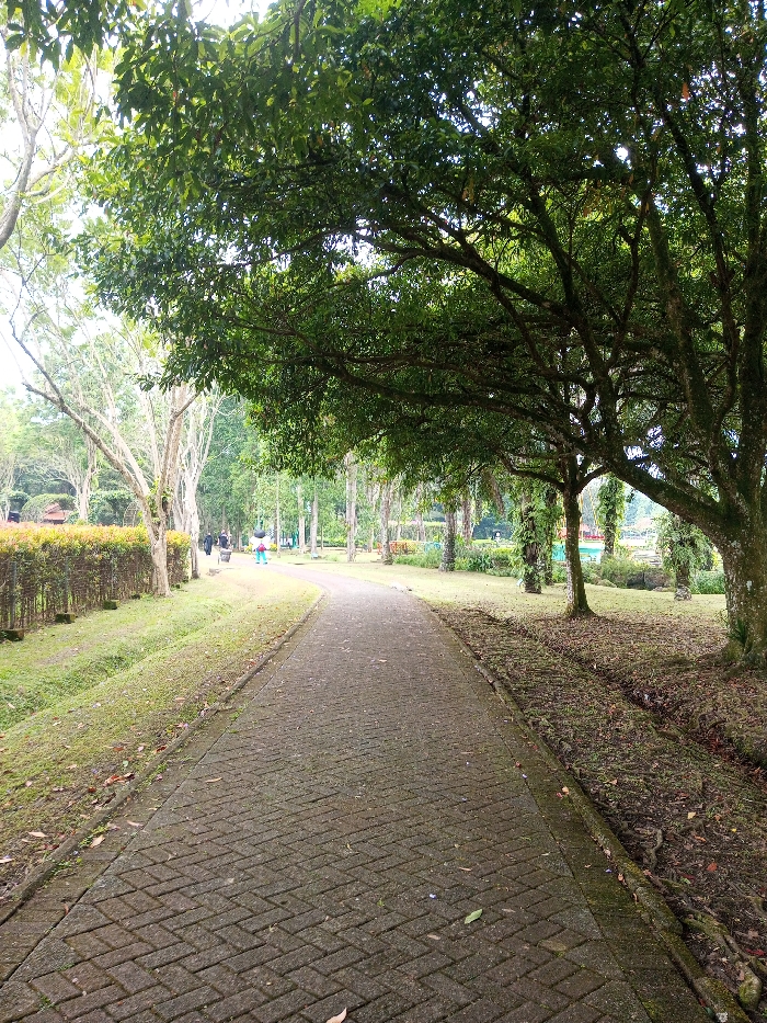 A paved pathway, herringbone pattern, winds through a verdant park. Lush green trees canopy the path, casting shadows. A manicured hedge runs along one side, while the other features tree roots and leaf litter. Distant figures walk in the park beyond the shaded path, implying a public space. The image evokes a serene, natural environment.