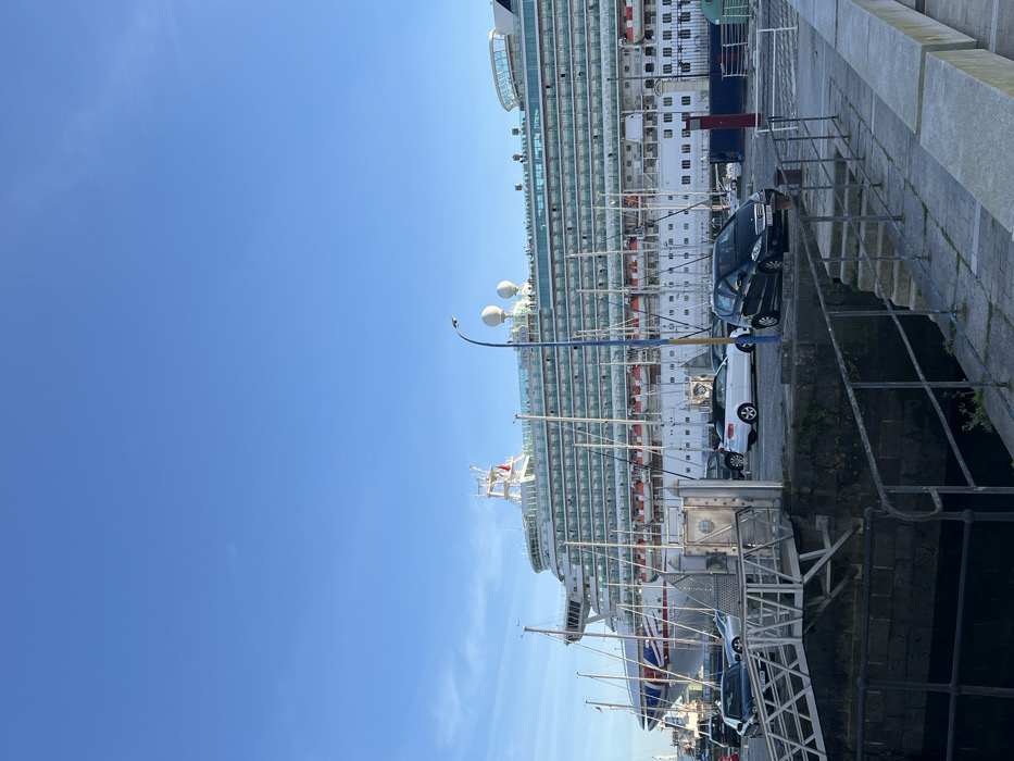 A wide shot depicts a harbor scene in A Coruña, Spain, under a clear, bright blue sky with high sunlight. The central and dominant feature is the large, white-hulled cruise ship "VENTURA" (P&O Cruises), docked on the right side of the frame. The ship displays numerous decks of balconies with light green glass and a red and blue funnel logo. To the left and in front of the cruise ship, several smaller sailboats are moored, identifiable by their tall, slender masts. In the foreground, a paved quayside extends across the lower portion of the image. On the left, a metal gangway descends from the quay towards the water. Adjacent to it is a concrete structure with a gate-like mechanism. Further right, a set of stone steps with a dark metal handrail leads down to the water level. Several vehicles are parked on the paved quay, including a dark Mercedes-Benz A-Class hatchbach centrally located, and a white convertible car further behind it. A black street lamp with two spherical white light fixtures stands prominently towards the center-right. The water visible below the quay is dark. No discernible people are individually identifiable or engaged in specific actions.