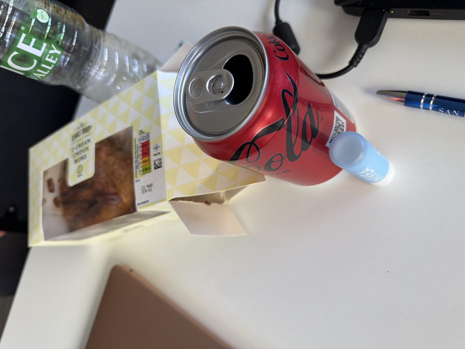 An overhead, slightly angled view depicts a white tabletop surface in an indoor environment. A partially open cardboard box, light yellow with a geometric pattern, is centered in the upper-middle, containing "CAKE SHOP CREAM CHOUX BUNS" with a visible "BEST BEFORE 21 MAR 13:41" date and nutritional information. Behind it, a partially full clear plastic bottle of "ICE VALLEY" water stands upright. In the lower-middle-right, an open red Coca-Cola aluminum can lies tilted. Directly in front of the can is a light blue cylindrical lip balm, possibly "NIVEA." Below the lip balm, a dark blue and silver ballpoint pen with partially visible "SAN" text is present. A brown electronic device, likely a laptop or tablet, is partially visible on the far left. A black electrical cable connected to a black rectangular device is visible in the lower right corner. No individuals are visible. The items suggest recent consumption of snacks and beverages, potentially alongside work or leisure. While product branding is consistent with the United Kingdom, no specific visual indicators within the image confirm the location as Manchester.
