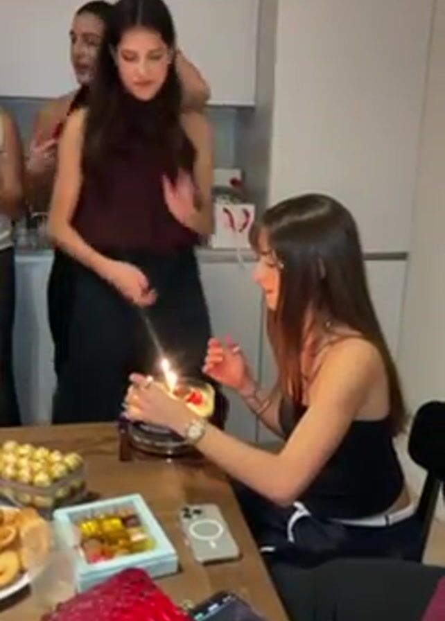 Several people are gathered around a table in a room that appears to be a kitchen or dining area. A birthday cake with lit candles sits on the table. One woman wearing a black top and dark pants is seated at the table looking at the cake. Another woman, wearing a dark purple top and dark pants stands beside the table and speaks. A third woman wearing a black top and dark pants stands behind the seated woman and holds a phone. The table is also covered with various items including a box of chocolates, cookies, and mobile phones. Birthday decorations are visible in the background.