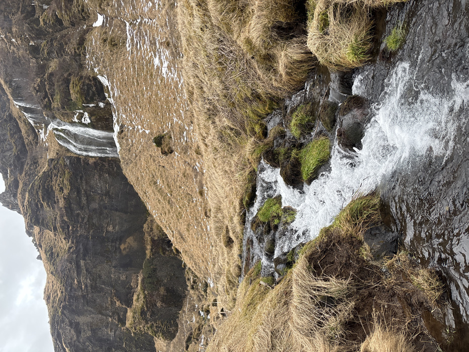 A rocky cliff face looms beneath a cloudy sky. Patches of snow and dry grasses cling to the cliff's side. A stream cascades over rocks covered in green moss and flows away, creating a dynamic, textured scene. The landscape displays a rugged, natural beauty.