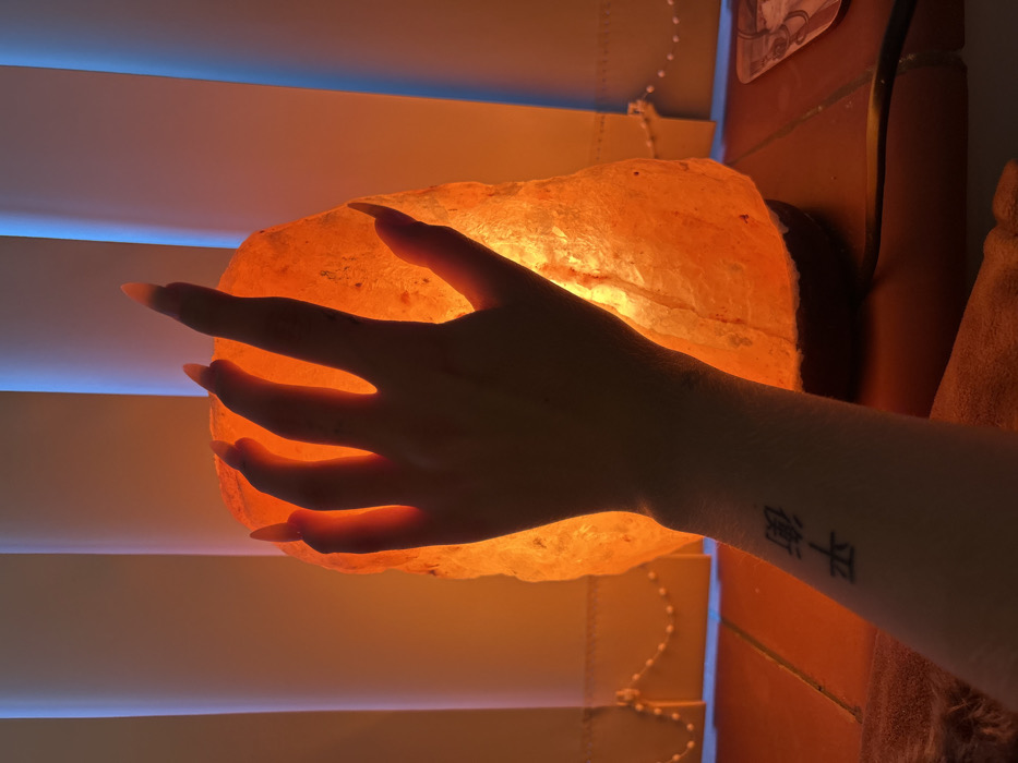 A human left hand is positioned against a lit Himalayan salt lamp in an indoor setting