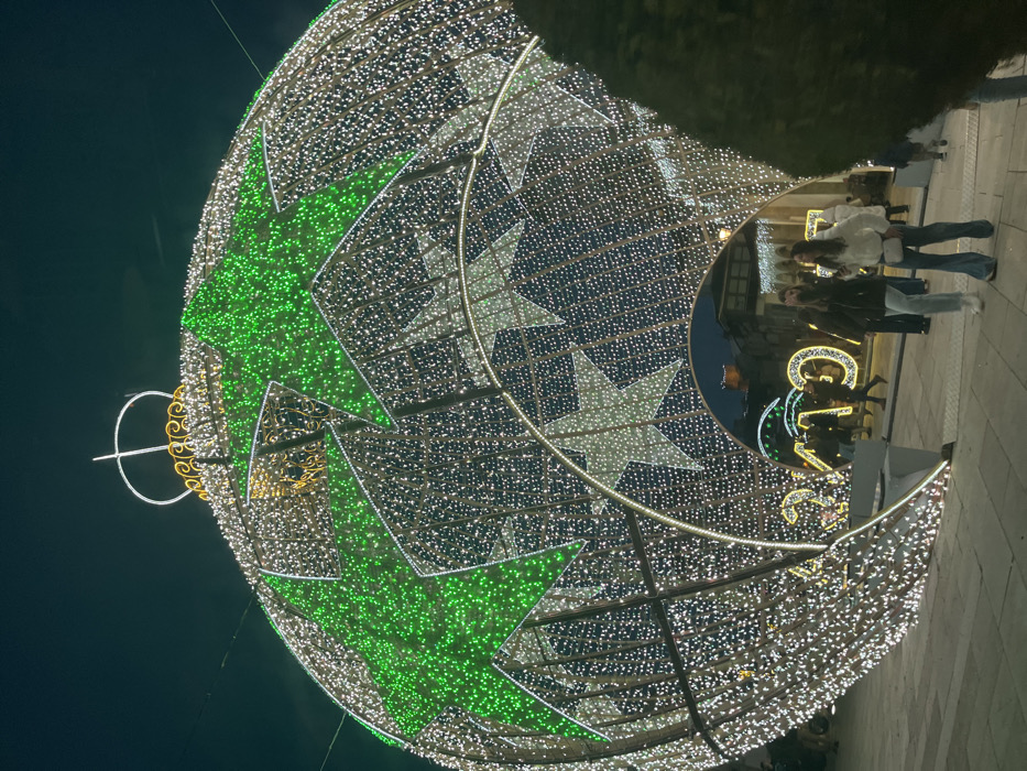 - "A giant, illuminated Christmas ornament dominates the scene, displaying green and white stars on its surface" by FM-IiCPk1, licensed under CC BY 4.0