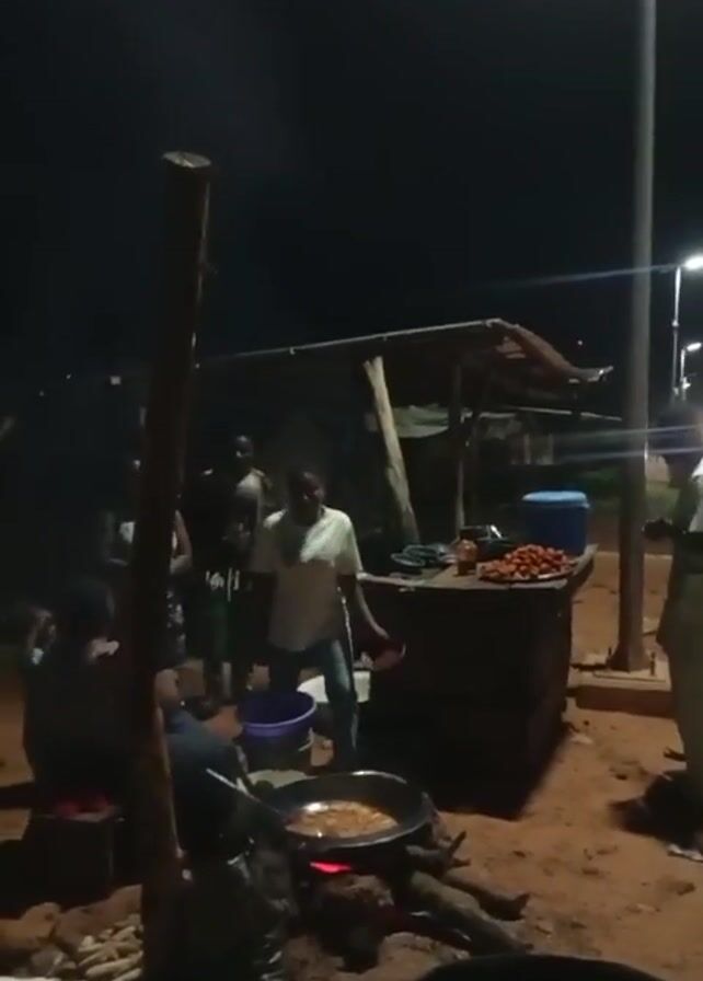 At night, a roadside food stall is lit by streetlights. A person fries food in a large pan over a wood fire. Several people stand around the stall. Some are wearing white shirts and dark pants. A blue container sits on the stall's counter. Other items are visible on the counter as well, including what appear to be fried items. Cars pass by on the road in the background.