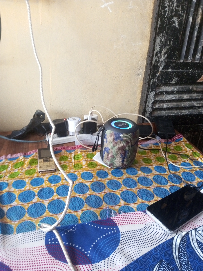 A table covered with a colorful patterned cloth displays several electronics. A camouflage-patterned speaker with a glowing blue top sits near a white multi-outlet power strip crammed with various chargers. A black smartphone lies on the right side of the table, and a small brown flip phone is visible on the left. White cables snake across the surface, connecting devices to the power strip. A partially visible weathered door stands behind the table.