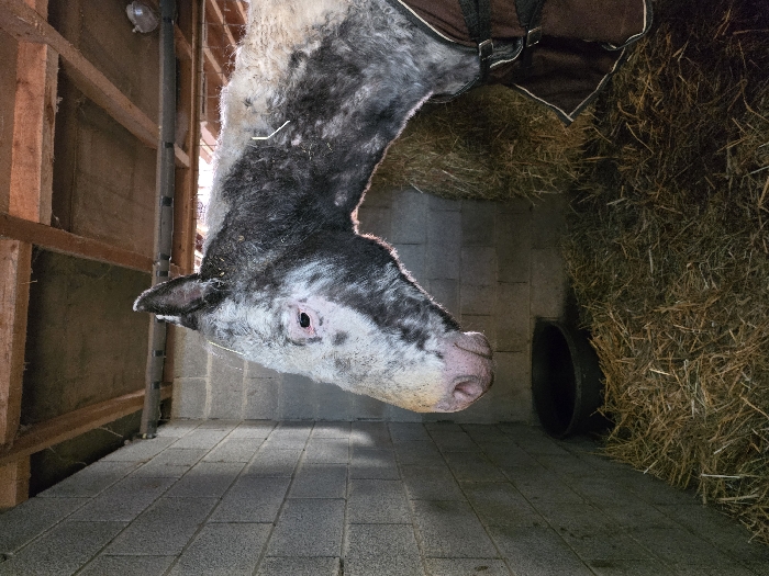 - "A spotted cow wearing a blanket bends its head down towards the gray tiled floor" by FM-dTRWD3, licensed under CC BY 4.0