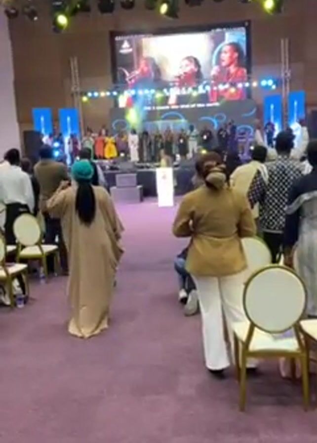 choir performing on a stage in a large auditorium filled with seated audience members. A large screen above the stage displays a close-up of the choir singing. The choir members are dressed in a variety of colors and styles, and the audience members are also dressed in a mix of casual and formal attire. The auditorium has purple carpeting and cream-colored chairs. The stage is well-lit with blue and green lights, and there is scaffolding above the stage. The audience appears to be attentive and respectful of the performance.