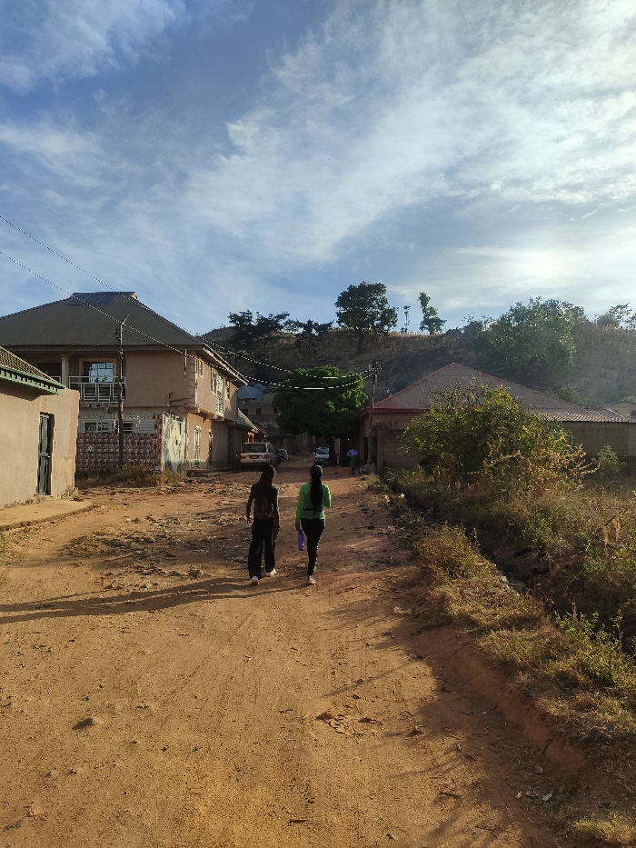Two young women stroll down a dirt road flanked by modest buildings under a bright sky. The road is rough, bearing the marks of erosion and wear. The buildings are simple, constructed with basic materials and varying architectural styles. A hill with sparse vegetation rises in the distance. The scene evokes a sense of rural life or a developing area with clear skies.