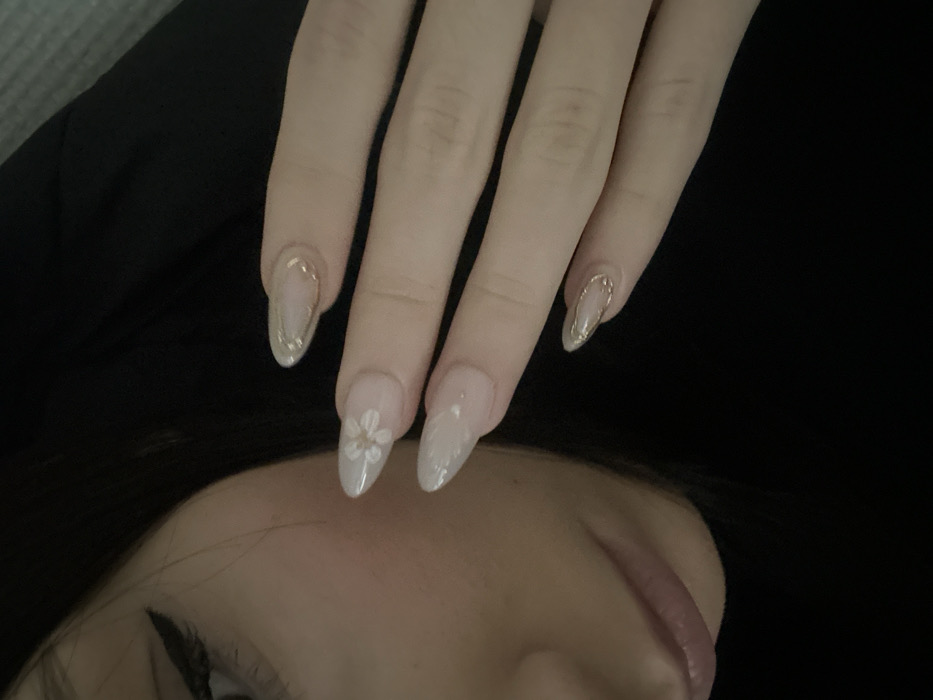 The image captures a close-up of an individual, presumably located in Schiltigheim, France. The upper left portion of the frame shows the left side of a face, including an eye with a dark winged eyeliner, a portion of the cheek, and the corner of the mouth. The person's hair or clothing appears dark, forming a largely indistinct background. The right side of the image prominently displays a left hand, positioned near the face. The fingernails are long, almond-shaped, and professionally manicured. The nail on the index finger features a milky white base with a white floral design. The middle finger's nail has a plain milky white base. The ring and little fingers display nails with a milky white base complemented by a thin, delicate gold outline tracing the perimeter of the nail, near the cuticle and tip. No further environmental details are discernible.