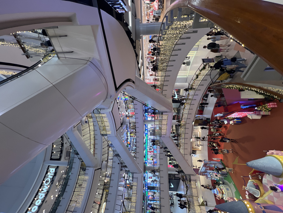 This image captures the multi-story interior of CentralWorld shopping mall, located in Bangkok, Thailand