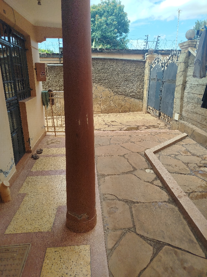The image provides a forensic view of an outdoor courtyard and building entrance located in Kihara ward, Kenya. A large, reddish-brown cylindrical column dominates the center-left foreground. To its left, a cream-colored building facade features a dark metal security door and a window secured with dark metal bars. The building's porch floor is covered with a pattern of yellow speckled rectangular tiles bordered by reddish speckled tiles. On this porch, a light-colored, cylindrical pot rests near the column, and two dark, irregular objects are positioned closer to the door. A metal railing is visible further back on the porch, with a green cloth draped over it, and a light-colored box is mounted on the building wall. To the right of the column, the courtyard floor consists of irregularly shaped, light brown flagstones with dark grout, showing evidence of moisture. An 'L'-shaped border of reddish speckled material is embedded in the flagstone paving in the lower right. The courtyard is enclosed by a dark, textured concrete wall exhibiting crack patterns, topped with razor wire and barbed wire. A dark blue/black ornate double-gate, featuring decorative elements, is set within stone pillars topped with spherical finials on the right side of the frame. Beyond the wall and gate, green trees and a partly cloudy blue sky are visible.