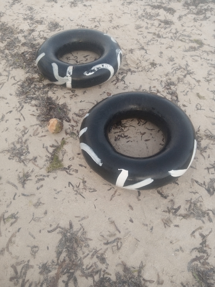 The image depicts a sandy beach scene in Shanzu ward, Kenya. Two dark-colored inflatable rings, resembling inner tubes, are positioned on the light-tan sand. The upper ring displays white painted markings, with fragmented letters that appear to form "YU 4". The lower ring exhibits multiple irregular white painted stripes on its outer circumference. Between the two rings, slightly to the left, lies a small, roughly spherical, light brown object consistent with a coconut husk fragment or small coconut. The sandy surface is covered with scattered dark, dried fragments of seaweed or seagrass. No individuals are visible in the scene.