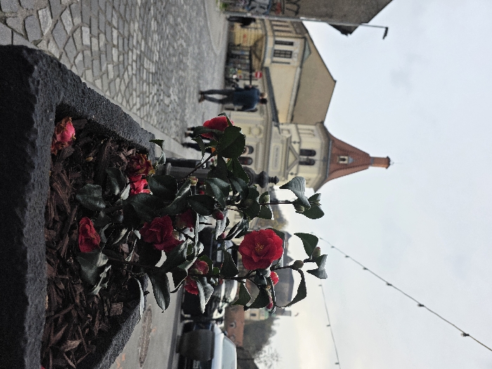 The image captures an urban street scene in Ljubljana, Slovenia, specifically on a cobblestone street adjacent to the Slovenian National Gallery, with Ljubljana Castle visible in the distant background. In the immediate foreground, a dark grey rectangular planter box is filled with dark wood chip mulch, from which a plant with dark green leaves and several red camellia flowers emerges. Some red petals and wilted flowers lie on the mulch. A cobblestone pathway extends from the lower left towards the midground. Two individuals are walking away from the camera on this path; the closer person is dressed in a dark blue jacket. A black streetlamp pole is visible on the far left. The midground is dominated by the Slovenian National Gallery, a light-colored building featuring a distinctive reddish-orange conical roof and a rounded central facade with arched windows. Decorative black bollards stand in front of this building. To the right of the cobblestone path, a street contains multiple parked dark-colored vehicles. String lights with visible bulbs stretch diagonally across the upper portion of the frame. The sky is overcast. In the far background, a tree-covered hill is visible, with the faint outline of Ljubljana Castle discernible atop it.