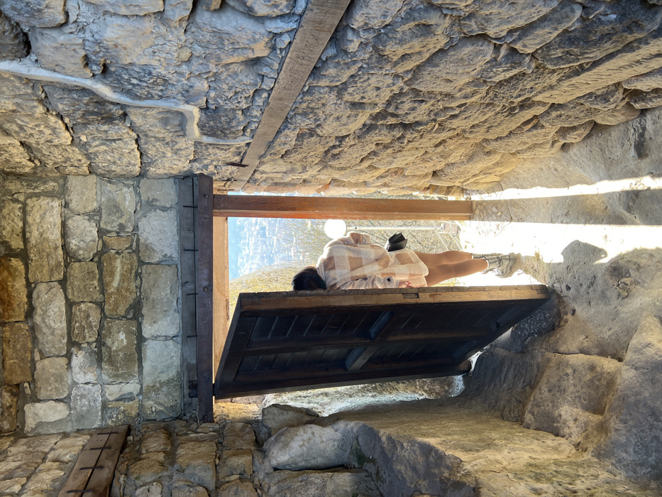An adult individual is depicted from behind, standing at the threshold of a roughly hewn stone doorway, observing a panoramic view of the city of Provadia, Bulgaria. The setting is within an ancient stone structure, likely a fortress or castle, characterized by thick walls constructed from irregular, light-colored stone blocks and integrated horizontal wooden beams. A dark, vertically planked wooden door is ajar, angled towards the left. The person wears a light-toned, possibly beige and white, plaid long-sleeved shirt or jacket, with bare legs and light-colored boots. A small, dark shoulder bag is visible on their right side. Outside the doorway, a clear, sunlit sky illuminates the distant city, which features buildings nestled in a valley or plain, surrounded by hills. Sparse deciduous vegetation is visible on the terrain immediately outside the structure. A white spherical light fixture mounted on a thin pole stands to the right of the doorway on the exterior. The uneven stone ground within the passage shows distinct shadows cast by strong sunlight entering from the outside.