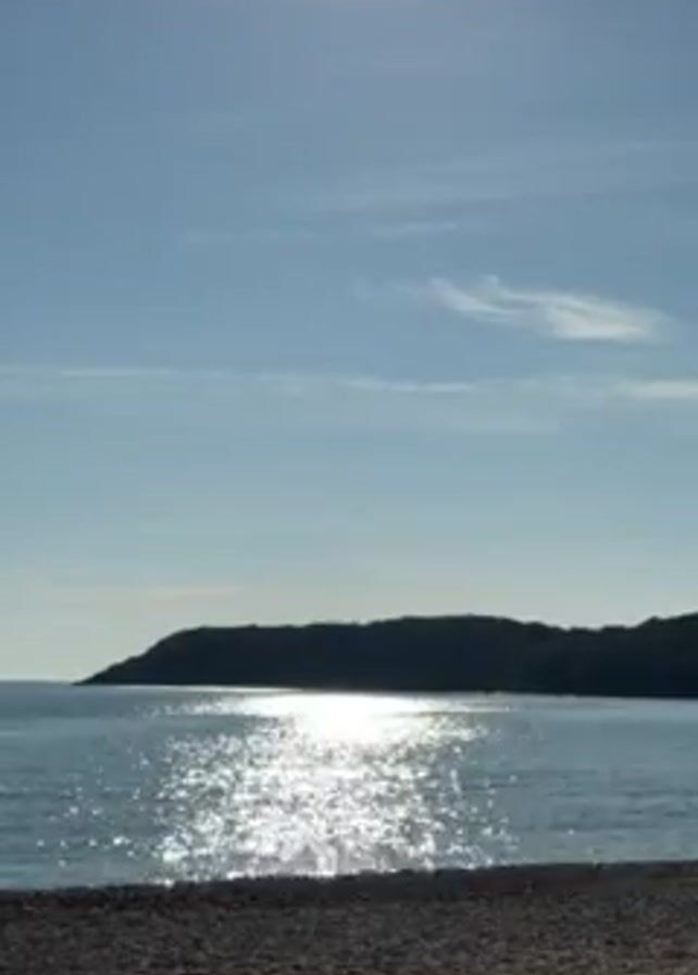 beach scene under a bright sun, with the horizon visible over the ocean. A dark, elongated landmass is seen in the distance across the water. Sunlight reflects off the ocean surface. The beach in the foreground appears to be made of pebbles. The sky is mostly blue with a few wispy clouds. The camera is static and there is no notable movement. There are inaudible human voices in the background.