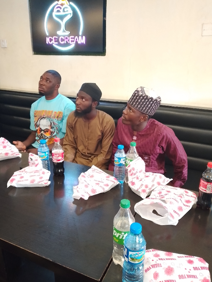 Inside a commercial establishment in Darmanawa, Nigeria, three adult males are seated side-by-side at a dark wooden table in front of black booth seating