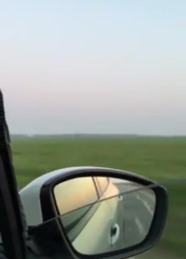 view from the passenger seat of a car moving along a road. The side mirror of the white car is visible, reflecting a warm-toned light, possibly from the setting sun. Outside the car, there's a flat, green field stretching out to the horizon under a pale, blue-gray sky. A tall, white structure appears briefly in the distance. The car seems to be driving on a fairly smooth road.