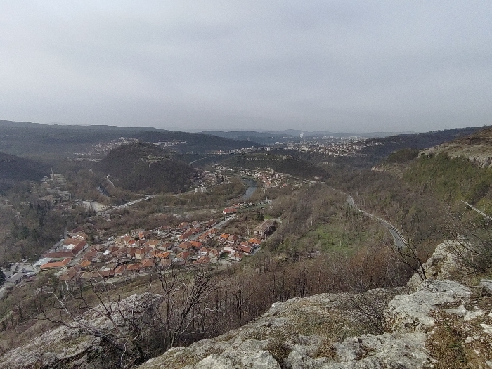 This image presents a panoramic, elevated view of a valley and a portion of the city of Veliko Tarnovo, Bulgaria, under an overcast sky