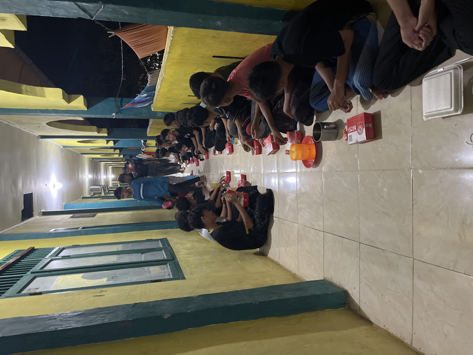 A group of young boys sit in a long row along a tiled floor inside a building. They are eating from small red containers, with boxes of food and other items placed in front of them. A yellow wall with a dark green baseboard runs along the side with a window. The building appears to be dimly lit, and other rooms are visible down the corridor.