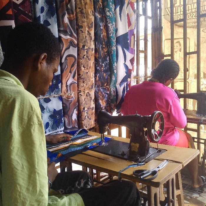 The image depicts an indoor scene within a tailor's workshop in Nsugbe, Nigeria