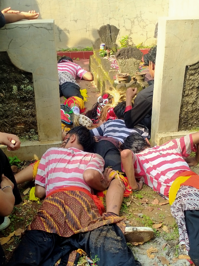 The image depicts an outdoor scene in Sumberejo, Indonesia, within what appears to be a grave or shrine area. At least seven individuals are lying prone or hunched on the dirt ground, several facing downward, among concrete structures and a raised stone tomb. Many wear red and white striped shirts and dark trousers; some have traditional patterned sarong-like garments around their waists and yellow or red fabric ties around their calves or ankles. Mud stains are visible on clothing and legs. In the mid-ground, several traditional Jathilan or Kuda Lumping performance masks and a horse puppet head, characterized by red faces, white eyes, black hair, and long fiber manes, lie discarded on the ground amidst the prone individuals. One person in a black shirt is visible kneeling or sitting upright near these masks on the right. The central grave structure in the background is made of dark stone with decorative carvings, possibly including a headstone. On its surface, several small ceramic bowls, red petals, and a modern beverage can are arranged, indicating offerings. The background features a light-colored, weathered concrete wall with visible cracks. The ground consists of soil, dry leaves, and sparse green vegetation. Partial views of observers' hands are visible on the far left, one holding a small, metallic object. The scene appears to capture the aftermath of a ritual or performance involving trance.