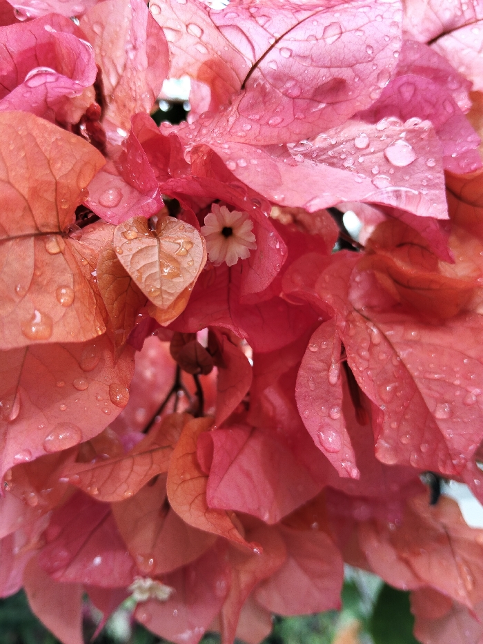 Close-up of bougainvillea flowers in varying shades of pink and orange, covered in water droplets
