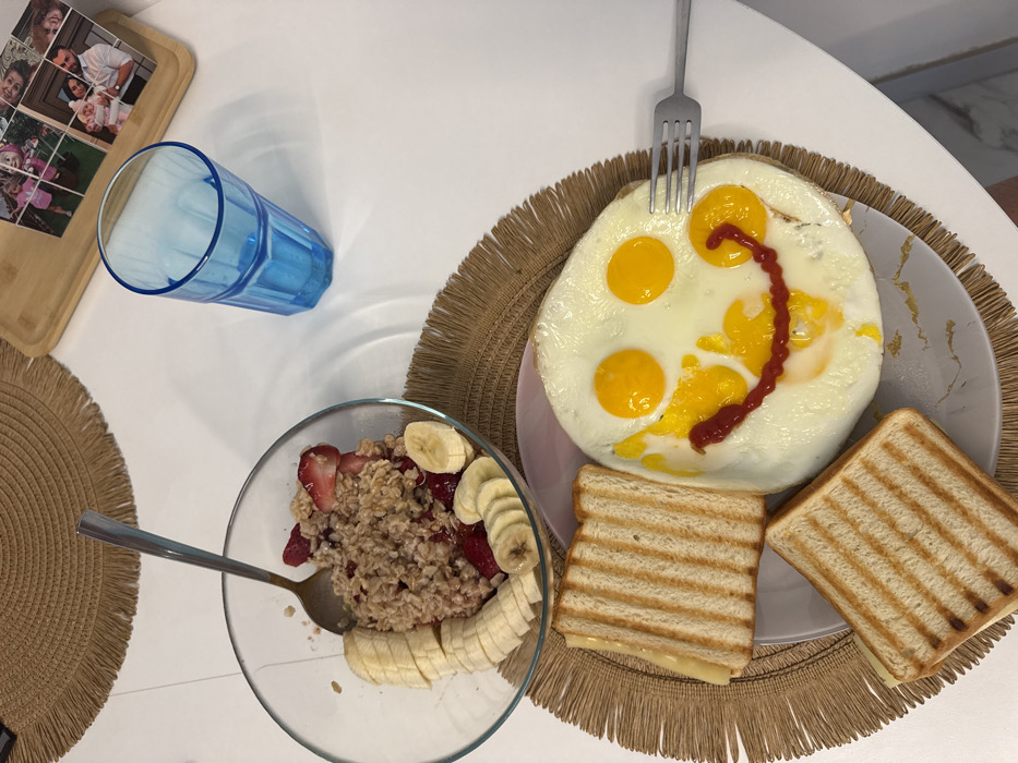 The image displays a meal laid out on a white table surface, situated in Dubai, United Arab Emirates. On the left, a clear glass bowl contains oatmeal topped with sliced bananas and strawberries, with a silver spoon resting within. To its right, a light pink and grey marbled plate holds two triangular grilled cheese sandwiches and a multi-yolk fried egg. The fried egg is configured to resemble a face, utilizing three bright yellow yolks as eyes and a nose, with a red condiment, likely ketchup, drawn in a curved line beneath to form a smile. A silver fork is inserted into one of the egg yolks. A blue, textured glass containing a clear liquid stands to the upper right of the plate. Two woven, circular placemats in a light brown hue are positioned beneath the food items. In the background, on a light wooden tray, a collage of photographs depicting adults and children is partially visible.