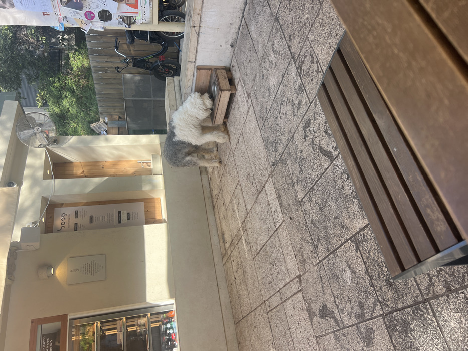 An Old English Sheepdog, predominantly white with gray markings on its back and head, drinks water from a metal bowl secured in a wooden stand on an outdoor tiled patio in Tel Aviv, Israel. The dog is positioned centrally in the mid-ground, facing right with its head lowered into the bowl. To the left, a light-colored building forms the background, featuring a glass display window with shelved items and a recessed wooden door. Two signs with Hebrew text are affixed to the building, one bearing the word "ספטל". A wall-mounted oscillating fan and a small sink are visible on the building's exterior. To the right of the scene, a wooden fence delineates the patio from an area with green foliage. A raised concrete platform hosts two parked bicycles: a black moped-style e-bike and another dark-colored bicycle. A post covered with various flyers, some featuring Hebrew script, stands on the far right. The ground is paved with textured, irregularly shaped gray and dark gray tiles. In the immediate foreground, the dark brown wooden slats of a bench or table are partially visible, suggesting the perspective of someone seated. The scene is brightly lit, casting distinct shadows.