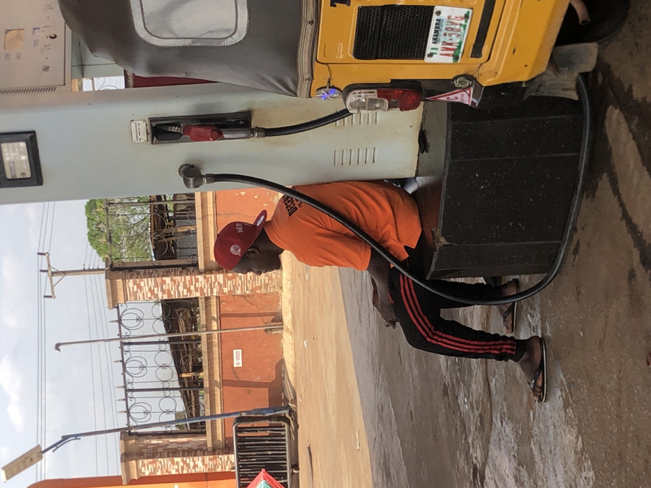 An adult male, dark-skinned, is seated facing left on a dark hexagonal base at a gas station in Nsugbe, Nigeria