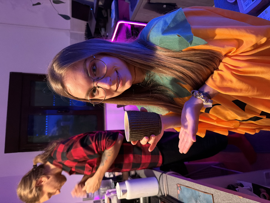 The image displays an indoor scene in Boreti, Montenegro, featuring two individuals. A young adult female with long light brown hair and round eyeglasses occupies the foreground, facing the camera with a slight smile. She is wearing a loose, layered orange and green garment, resembling a pumpkin costume, and a light grey scrunchie on her left wrist. She holds a dark, ribbed mug containing a beverage in her right hand at chest level, while her left hand is extended forward, palm open and upward. In the background, to the left, a male adult with long brown hair tied in a ponytail and a beard is partially visible and out of focus. He wears a red and black plaid long-sleeved shirt, dark pants, and has a tattoo on his left forearm. He stands at a counter, seemingly engaged in an activity involving a white cylindrical appliance and other items. The environment includes a dark-framed window in the far background showing a blurred exterior with blue lights. To the right, a silver laptop is positioned on a raised stand on a desk, illuminated by a neon pink/purple LED strip light behind it. A green plant is partially visible in the upper right corner. The ambient lighting within the interior space exhibits purple and pink hues.