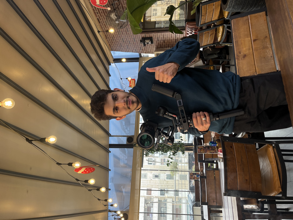 A young adult male, appearing to be in his twenties, stands centered in a casual dining establishment in Kafr Sousa Municipality, Syria, identified by a visible "Road House" sign. He has dark hair, a light mustache and goatee, and is wearing a dark teal turtleneck sweater over a light-colored undershirt and black trousers. A silver ring is visible on his left ring finger. He holds a professional camera rig, consisting of a black camera (identifiable as a Sony Alpha series with a large lens and green filter) mounted on a gimbal stabilizer, with both hands. His right hand is raised in a "thumbs-up" gesture, and he has a slight smile directed towards the camera. The establishment features a retractable or slatted beige canopy ceiling with string lights containing exposed incandescent bulbs. Festive red and white decorations, resembling stockings and a Santa hat, are hanging from the lights and on a brick-patterned wall to the right. The floor is not visible. Numerous empty wooden tables with dark metal frames and chairs with light brown seats are arranged throughout the space. One table in the foreground has a small metal stand. A dark brown Chesterfield-style booth is partially visible against the brick wall. A large potted plant is also visible to the right. Large glass windows in the background overlook an urban street scene with multi-story buildings and some greenery. The overall lighting is bright, a mix of natural light from the windows and artificial light from the ceiling fixtures.